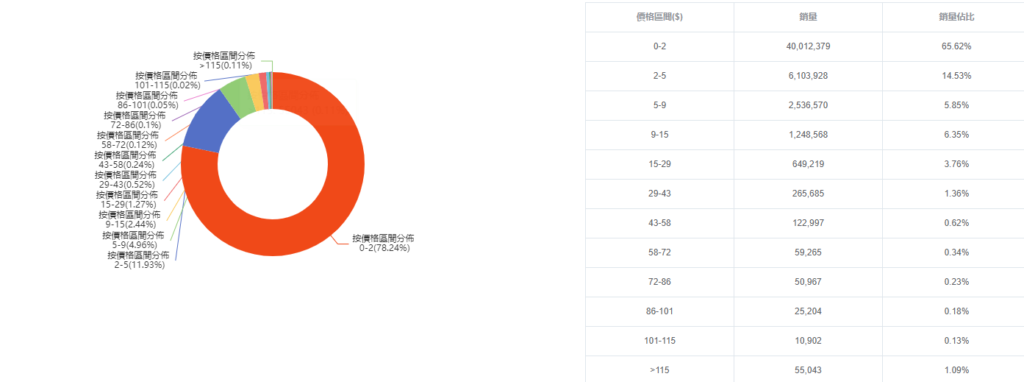 依照 Shopee 越南價格區間可以了解,銷售價格落在0~2美金銷量佔比為65.62%,銷量最佳,銷售價格落在2-5美金,銷量佔比14.53%,銷量次之,銷售價格落在9-15美金,銷量排第三,從此數據可以得出結果,普遍越南消費者的購買力相對較低,多數消費者在 Shopee 購物還是以低價商品為主,超過15美金以上,購買力道呈現下降趨勢。