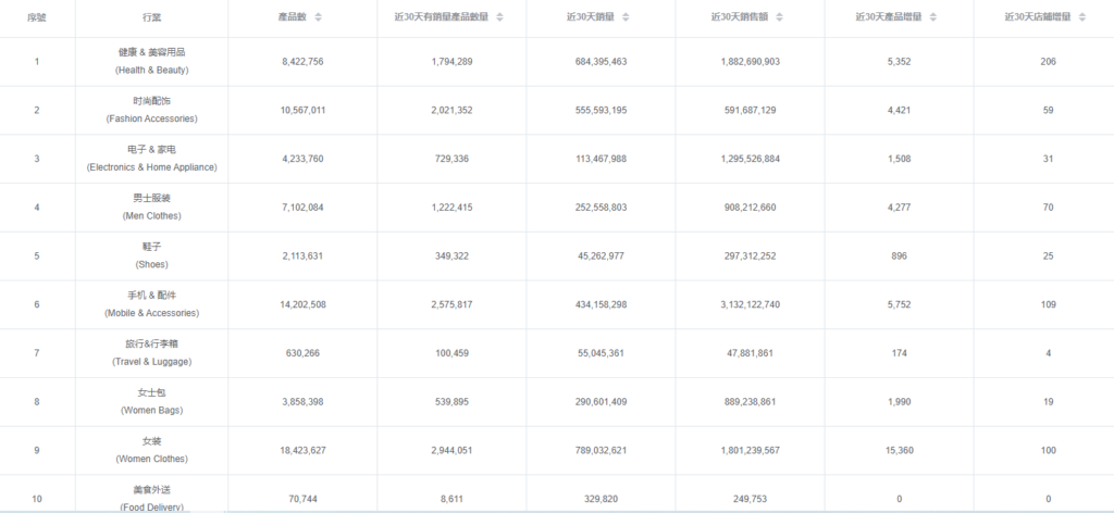 以下數據為近30天銷售量之數據,透過數據可以得知,近30天銷售量與銷售額最高的是健康與美容用品,同時產品數也是最多的超過800萬的產品,健康與美容用品產業較為競爭,雖然消費額與銷售量較高,但要在此產業有一席之地勢必要投對相應的行銷資源去進行產品推廣。