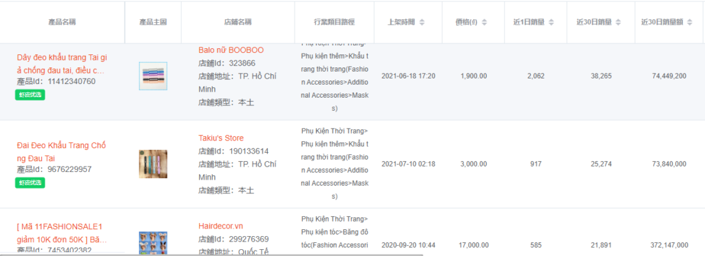 由於疫情的影響下,因此防疫相關的時尚配件銷售激增,由於口罩戴的時間過長會引起不適,因此抗耳痛面罩帶在越南 Shopee 時尚配件類佔首位。