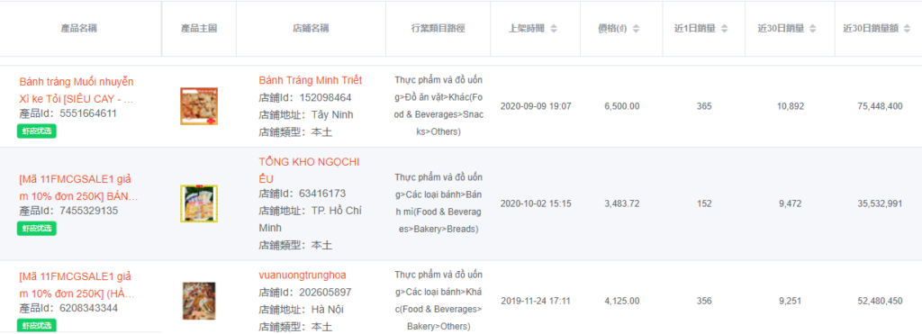 在食品類型銷售第一為越南當地零食,其餘前十名皆為中國零食。